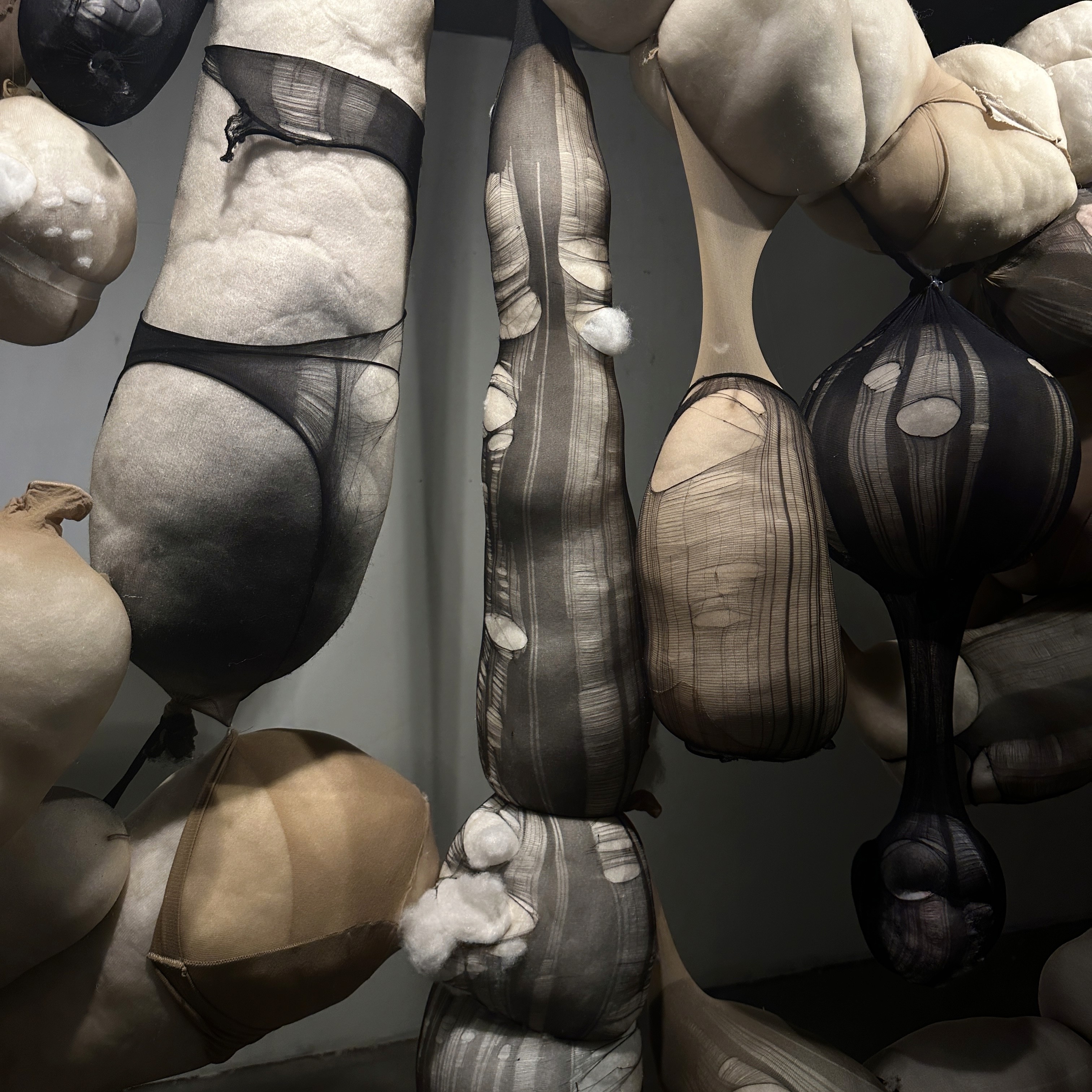 Specifically, I chose to emphasize the double eyelid surgery, arranging facial features with a primal density to underscore the normalized and desensitized nature of this particular procedure within society. An intriguing aspect of the assembly process lies in its sustainability. All materials used were recycled—I collected discarded pillows to create a bodily form, encapsulating them with my own personal tights.